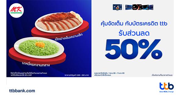 มิติหุ้น – ทีเอ็มบีธนชาต หรือ ทีทีบี มอบความคุ้มแบบจัดเต็มให้กับสมาชิกบัตรเครดิต ttb บัตรเครดิต ttb Global House และบัตรเครดิต ttb Disney ด้วยโปรโมชันสุดพิเศษรับส่วนลด 50% สำหรับเมนูจานเด็ด “เป็ดย่าง MK จานเล็ก” และ “บะหมี่หยกจานกลาง” จากราคาปกติ 269 – 292 บาท (ราคาสินค้าอาจแตกต่างกันแต่ละสาขา) เมื่อชำระค่าอาหารผ่านบัตรเครดิต ttb และมียอดขั้นต่ำ 1,000 บาทขึ้นไป / เซลล์สลิป จำกัด 1 สิทธิ์ / ท่าน / ใบเสร็จ / วัน (สูงสุด 2 สิทธิ์ / ท่าน ตลอดรายการ) โดยสิทธิพิเศษนี้สำหรับการรับประทานที่ร้าน MK Restaurants ทุกสาขาทั่วประเทศ ตั้งแต่วันที่ 1 พฤศจิกายน 2568 – 11 มกราคม 2569 ศึกษารายละเอียดเพิ่มเติมของโปรโมชัน ได้ที่ https://www.ttbbank.com/th/promotion/credit-card/dining/mk-restaurants-nov25