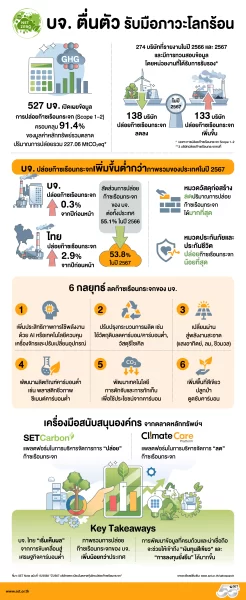 บริษัทจดทะเบียนในตลาดหลักทรัพย์แห่งประเทศไทยและตลาดหลักทรัพย์เอ็ม เอ ไอ (ตลาดหุ้นไทย) 527 บริษัท (จากทั้งหมด 861 บริษัท หรือ 91.4% ของมูลค่าหลักทรัพย์รวมทั้งตลาด) เปิดเผยปริมาณการปล่อยก๊าซเรือนกระจกในปี 2567 ซึ่งมีข้อสรุปที่น่าสนใจ ดังนี้
