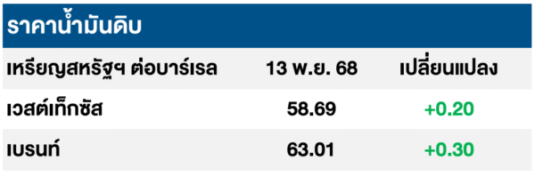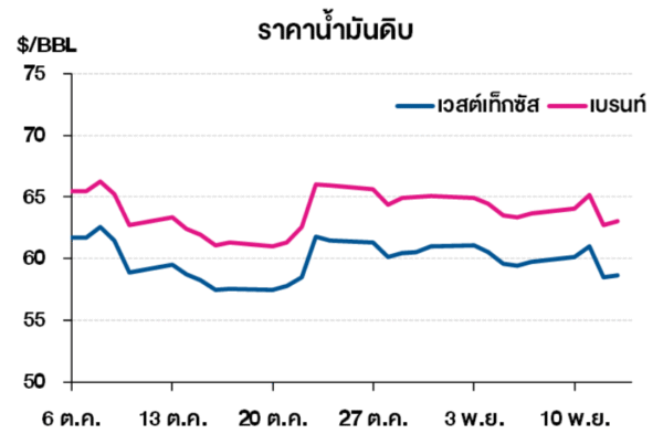(+) ราคาน้ำมันดิบเวสต์เท็กซัสและเบรนท์ปรับเพิ่มเล็กน้อย หลังหน่วยงานรัฐบาลสหรัฐฯ มีกำหนดกลับมาเปิดดำเนินการอีกครั้ง เมื่อวันพฤหัสบดีที่ผ่านมา ซึ่งคาดว่าจะช่วยกระตุ้นอุปสงค์น้ำมันได้ในระยะสั้น ขณะเดียวกันนักลงทุนกังวลเกี่ยวกับผลกระทบด้านอุปทาน จากมาตรการคว่ำบาตรของสหรัฐฯ ต่อบริษัท Lukoil ซึ่งเป็นบริษัทน้ำมันรายใหญ่ของรัสเซีย โดยมาตรการคว่ำบาตรนี้เป็นส่วนหนึ่ง ของความพยายามกดดันให้รัสเซียเข้าร่วมการเจรจาสันติภาพ เพื่อยุติสงครามในยูเครน ทั้งนี้ อาจส่งผลให้บริษัทต่างๆ ไม่สามารถทำธุรกรรมกับบริษัท Lukoil ได้หลังจากวันที่ 21 พ.ย. 68