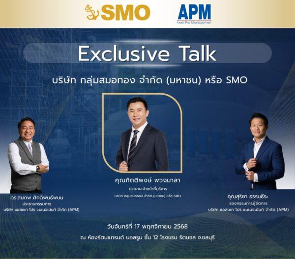 มิติหุ้น-งาน Exclusive Talk ของ บริษัท กลุ่มสมอทอง จำกัด (มหาชน) หรือ SMO ในวันที่ 17พฤศจิกายนนี้ ณ Grand Ballroom ชั้น 12โรงแรมรัตนชล ชลบุรี เป็นโอกาสที่ดีสำหรับผู้ที่สนใจอุตสาหกรรมปาล์มและธุรกิจพลังงานชีวภาพ ในการรับฟังข้อมูลทิศทางธุรกิจจากผู้บริหารอย่างใกล้ชิด จาก กิตติพงษ์ พวงมาลาCEO ที่จะมาตอกย้ำวิสัยทัศน์การเติบโตขององค์กร พร้อมรับฟังมุมมองเพิ่มเติมจากผู้บริหาร APM ได้แก่ ดร.สมภพ ศักดิ์พันธ์พนมและ คุณสุริยา ธรรมธีระ ที่จะเสริมภาพรวมด้านกลยุทธ์ ผู้เข้าร่วมจะได้รับข้อมูลที่ช่วยให้เห็นภาพอนาคตของ SMO ได้อย่างชัดเจนยิ่งขึ้นรวมถึงแนวคิดและแผนงานที่สะท้อนความมุ่งมั่นของบริษัทในการก้าวสู่การเติบโตอย่างยั่งยืน สำหรับผู้ที่ติดตามเส้นทางของ SMO งานนี้เป็นอีกหนึ่งโอกาสสำคัญในการทำความเข้าใจวิสัยทัศน์ขององค์กรอย่างใกล้ชิดค่ะ