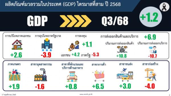 มิติหุ้น – น.ส.อ้อนฟ้า เวชชาชีวะ เลขาธิการ สำนักงานสภาพัฒนาการเศรษฐกิจและสังคมแห่งชาติ (สศช.) หรือ สภาพัฒน์ เปิดเผยว่า เศรษฐกิจไทยไตรมาสที่ 3 ผลิตภัณฑ์มวลรวมภายในประเทศ (GDP) ขยายตัว 1.2% ชะลอลงจาก 2.8% ในช่วงไตรมาส 2 รวม 9 เดือนของปี 2568 เศรษฐกิจไทยขยายตัว 2.4%