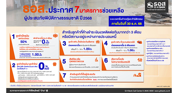 ที่เกิดขึ้นในหลายพื้นที่ทั่วประเทศ ทำให้เกิดการสะสมของปริมาณน้ำและท่วมบ้านเรือนประชาชน ส่งผลต่อความเป็นอยู่ และการประกอบอาชีพ ธอส. ในฐานะสถาบันการเงินเฉพาะกิจของรัฐ ที่มีพันธกิจ “ทำให้คนไทยมีบ้าน” พร้อมช่วยเหลือ ผู้ที่ได้รับผลกระทบผ่าน “มาตรการช่วยเหลือผู้ประสบภัย ปี 2568” โดยมีรายละเอียด ดังนี้