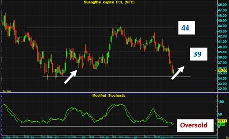 กราฟ MTC ทิ้งตัวลงจนกราฟสู่โซนต่ำสุดในรอบ 2 ปี และทำให้ Stoch เกิด Oversold อย่างมาก ซึ่งเป็นระดับที่ดีดตัวขึ้นต่อมาในทุกครั้ง  โดยในครั้งนี้ ถือเป็นจุดรับ และมีโอกาสเด้งตัวไปยังต้านแรกที่ 39 บาท