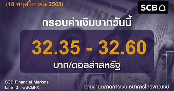 - กลุ่มงานตลาดการเงิน ธนาคารไทยพาณิชย์ ประเมินค่าเงินบาทวันนี้เคลื่อนไหวในกรอบ 32.35-32.60 บาท/ดอลลาร์