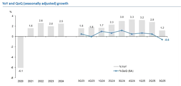• GDP ไตรมาส 3/2025 ชะลอตัวลงเป็น 1.2% YoY จาก 2.8% ไตรมาสก่อน ซึ่งต่ำกว่าคาดการณ์ของตลาดและเราที่ 1.6% โดยหากปรับฤดูกาลแล้ว เศรษฐกิจไทยจะหดตัวลง -0.6% QoQ, SA จาก 0.5% ไตรมาสก่อน โดยต่ำกว่าคาดการณ์ของตลาดที่ -0.3%