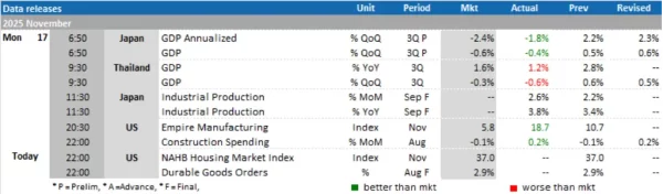 • สหรัฐฯ:ดัชนีราคานำเข้า (Import Price Index) ,ผลผลิตภาคอุตสาหกรรม (Industrial Production) เดือน ต.ค. และดัชนีการเคหะ (NAHB Housing Market Index) เดือน พ.ย.