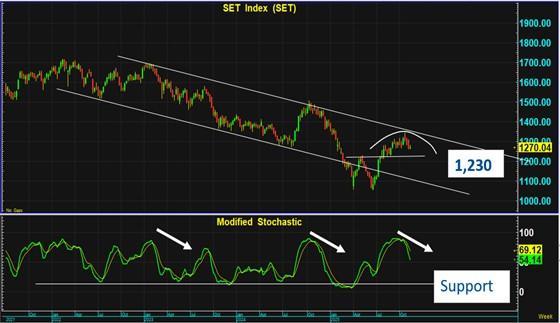 กราฟ SET ปรับตัวลงหลังเกิดการฟอร์มตัวเป็น Divergence เชิงลบมาอย่างต่อเนื่อง  ขณะที่การปรับลงนี้ทำให้กราฟเป็นรูปถ้วยคว่ำ และ Stoch ปรับลงเป็น Sell signal  มีโอกาสที่จะลงถึง 1,230 จุดในรอบนี้