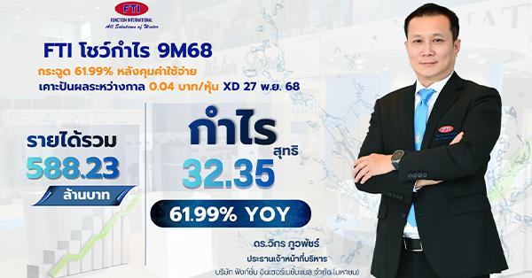 ดร.วิกร ภูวพัชร์ ประธานเจ้าหน้าที่บริหาร บริษัท ฟังก์ชั่น อินเตอร์เนชั่นแนล จำกัด (มหาชน) หรือ FTI เปิดเผยว่า สำหรับผลการดำเนินงานในช่วง 9 เดือนของปี 2568 บริษัทมีกำไรสุทธิ 32.35 ล้านบาท ปรับตัวเพิ่มขึ้น 12.38 ล้านบาท หรือคิดเป็นเพิ่มขึ้น 61.99% เมื่อเทียบกับช่วงเดียวกันปีก่อนที่มีกำไรสุทธิ 19.97 ล้านบาท และมีรายได้รวมจากการขายสินค้า และบริการอยู่ที่ 588.23 ล้านบาท ปรับตัวลดลลงเล็กน้อยที่ 24.10 ล้านบาท หรือคิดเป็นลดลง 3.94% เมื่อเทียบกับช่วงเดียวกันปีก่อนที่มีรายได้รวม 612.33 ล้านบาท