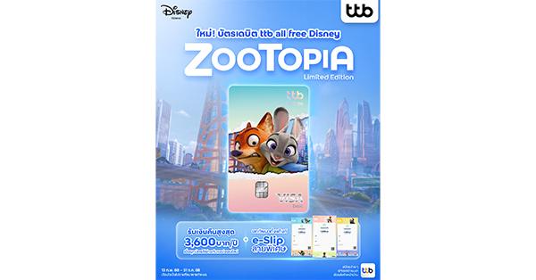 ลูกค้าสามารถสมัคร บัตรเดบิต ทีทีบี ออลล์ฟรี ดิสนีย์ ลายใหม่ “Zootopia Limited Edition” ได้ตั้งแต่วันที่ 18 พฤศจิกายน 2568 ผ่านแอป ทีทีบี ทัช เว็บไซต์ทีทีบี หรือที่ทีทีบีทุกสาขาทั่วประเทศ เพียงไม่กี่ขั้นตอนก็รับดีไซน์ลิมิเต็ดและสิทธิประโยชน์ครบถ้วน ดูรายละเอียดเพิ่มเติมได้ที่ https://www.ttbbank.com/th/personal/deposits/debit-card/ttb-all-free-disney-debit-cards