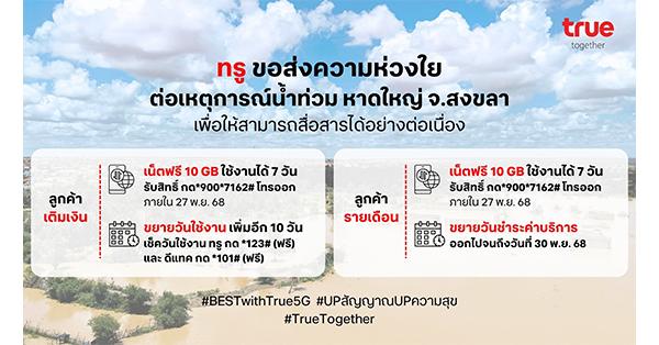 ทรู คอร์ปอเรชั่น ขอส่งกำลังใจให้พี่น้องชาวหาดใหญ่และชาวภาคใต้ทุกคน พร้อมดูแลโครงข่ายสื่อสารทั้งมือถือและอินเทอร์เน็ตบ้านให้ใช้งานได้ต่อเนื่อง เพื่อให้ประชาชนยังติดต่อกันได้ รับข่าวสารสำคัญ และประสานงานช่วยเหลือกันได้แม้ในช่วงวิกฤต นอกจากนี้ ทรู คอร์ปอเรชั่นพร้อมทำงานใกล้ชิดกับ กสทช. กรมป้องกันและบรรเทาสาธารณภัย (ปภ.) และหน่วยงานที่เกี่ยวข้อง เพื่อร่วมสนับสนุนการช่วยเหลือและบรรเทาความเดือดร้อนของประชาชนในทุกสถานการณ์