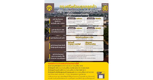 มาตรการที่ 1: พักชำระหนี้ นานสูงสุด 2 รอบบัญชี สำหรับลูกค้าที่มีสถานะบัญชีปกติที่อยู่ในพื้นที่ที่ได้รับผลกระทบจากน้ำท่วม โดยพักชำระหนี้สูงสุดไม่เกิน 2 รอบบัญชี ระหว่างเดือนพฤศจิกายน 2568 ถึง มกราคม 2569 โดยระหว่างเข้าร่วมมาตรการพักชำระดังกล่าว ดอกเบี้ยยังคงคำนวณตามอัตราปกติแบบลดต้นลดดอก