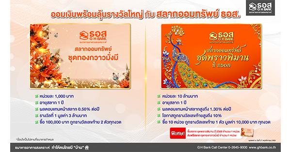 - สลากออมทรัพย์ ธอส. ชุดทองกวาวมั่งมี : หน่วยละ 1,000 บาท กรอบวงเงิน 20,000 ล้านบาท อายุสลาก 1 ปี ผลตอบแทนหน้าสลาก 0.50% ต่อปี ออกรางวัลทุกเดือนตลอด 12 งวด รางวัลที่ 1 มูลค่ารางวัลสูงถึง 3 ล้านบาท จำนวน 1 รางวัล รางวัลข้างเคียงรางวัลที่ 1 มูลค่ารางวัลละ 50,000 บาท จำนวน 2 รางวัล รางวัลที่ 2 มูลค่ารางวัลละ 10,000 บาท จำนวน 10 รางวัลต่อหมวด รางวัลเลขท้าย 3 ตัว รางวัลละ 100 บาท (หมุน 1 ครั้ง) จำนวน 20,000 รางวัล และรางวัลเลขท้าย 2 ตัว รางวัลละ 50 บาท (หมุน 1 ครั้ง) จำนวน 200,000 รางวัล ซื้อ 100,000 บาท การันตีถูกรางวัลเลขท้าย 2 ตัวทุกงวด รับผลตอบแทนขั้นต่ำ 10% ต่อปี หากซื้อ 1,000,000 บาท การันตีถูกรางวัลเลขท้าย 2 ตัว และเลขท้าย 3 ตัวทุกงวด รับผลตอบแทนขั้นต่ำ 1.22% ต่อปี ซื้อสลากออมทรัพย์ ธอส. ชุดทองกวาวมั่งมี ตั้งแต่วันที่ 2 – 12 ธันวาคม2568 วงเงินตั้งแต่ 100,000 บาท ขึ้นไป จะได้รับบัตรชมภาพยนตร์ MAJOR CINEPLEX มูลค่า 260 บาท หรือจนกว่าของสมนาคุณจะหมด (จำนวน 1 ท่าน ต่อ 1 ใบ)
