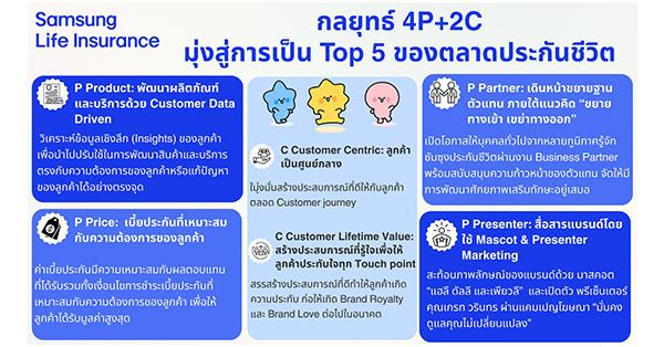 คุณศิริพร ศิริวัฒนกุล ประธานเจ้าหน้าที่สายงานกลยุทธ์การตลาด บริษัท ซัมซุงประกันชีวิต (ประเทศไทย) จำกัด (มหาชน) เปิดเผยว่า “ปัจจุบันมียอดขายใหม่อยู่ที่ 186.18 ล้านบาท และกำไรก่อนหักภาษีมากกว่า 58.54 ล้านบาท (ตัวเลข ณ สิ้นเดือนตุลาคม) คาดการณ์ว่าไตรมาสสุดท้ายในปีนี้ จะมีเบี้ยประกันภัยรับรวมประมาณ 820 ล้านบาท น่าจะส่งผลให้ในปี 2568 ทำได้ 2,520 ล้านบาท และคาดว่าจำนวนลูกค้าเพิ่มขึ้น 14% จากปี 2567 ทั้งจากช่องทางตัวแทนและ Bancassurance สะท้อนให้เห็นว่าบริษัทฯ มีการเติบโตอย่างต่อเนื่อง ทั้งในด้านยอดขายและกำไร ทั้งนี้บริษัทฯ ตั้งเป้าเพิ่มขึ้นเป็น 3,779 ล้านบาท เติบโตมากกว่า 150% จากปี 2568 ความสำเร็จทั้งหมดจะมาจากแผนกลยุทธ์ 4P+2C ที่จะขับเคลื่อนธุรกิจเพื่อพาซัมซุงประกันชีวิตไปสู่การเป็น Top 5 ของตลาดประกันชีวิต และสร้างการเติบโตอย่างยั่งยืน อันประกอบไปด้วย