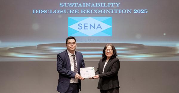 สำหรับปีนี้ บริษัท เสนาดีเวลลอปเม้นท์ จำกัด (มหาชน) ได้รับรางวัล Sustainability Disclosure Recognition ประจำปี 2568 ต่อเนื่องเป็นปีที่ 6 ซึ่งสะท้อนถึงมาตรฐานการเปิดเผยข้อมูลความยั่งยืนในระดับโดดเด่น (Recognition Level) ครอบคลุมทั้งด้าน ESG และการรายงานตาม SDG 12.6 ที่ส่งเสริมให้ภาคธุรกิจเปิดเผยข้อมูลด้านความยั่งยืนอย่างโปร่งใส เป็นระบบ และสอดคล้องกับมาตรฐานสากล