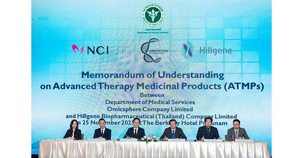 บริษัท แบงคอกจีโนมิกส์อินโนเวชั่น จำกัด (มหาชน) (BKGI), นายแพทย์ณัฐพงศ์ วงศ์วิวัฒน์ (ที่ 3 จากซ้าย) อธิบดีกรมการแพทย์ และ Dr. Dan Zhang MPH., M.D. (ที่ 3 จากขวา) Chairman บริษัท ฮิลจีน ไบโอ ฟาร์มาซูติคอล (ไทยแลนด์) จำกัด พร้อมด้วยสักขีพยาน ลงนามบันทึกความร่วมมือด้านผลิตภัณฑ์ทางการแพทย์ขั้นสูง (Advanced Therapy Medicinal Products: ATMPs) เพื่อผลักดันการพัฒนาเทคโนโลยีการรักษาสมัยใหม่ สู่การประยุกต์ใช้ประโยชน์ทางคลินิกและงานวิจัยของประเทศ