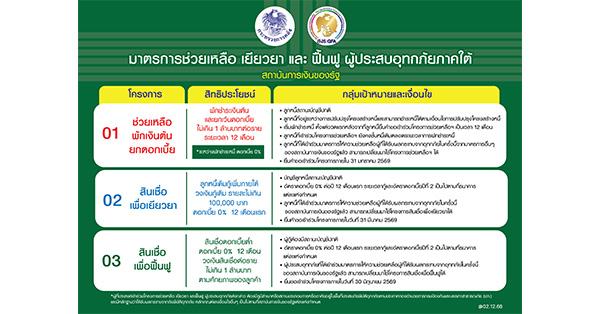 - โครงการช่วยเหลือ : พักเงินต้น ยกดอกเบี้ยให้แก่ผู้ประสบอุทกภัยภาคใต้ เพื่อบรรเทาความเดือดร้อน ช่วยให้กลับมาดำเนินชีวิตได้ตามปกติโดยเร็ว โดยพักชำระเงินต้นและยกเว้นดอกเบี้ย รายละไม่เกิน 1 ล้านบาท เป็นเวลา 12 เดือน โดยระหว่างพักชำระหนี้ ดอกเบี้ย 0% สำหรับบัญชีลูกหนี้สถานะบัญชีปกติ และบัญชีลูกหนี้ที่อยู่ระหว่างปรับปรุงโครงสร้างหนี้และสามารถชำระหนี้ได้ตามเงื่อนไขการปรับปรุงโครงสร้างหนี้ โดยลูกหนี้ที่เข้าร่วมมาตรการพักชำระหนี้ ยังคงชั้นหนี้เดิมตลอดระยะเวลาการพักชำระหนี้ ทั้งนี้ ลูกหนี้ที่ได้เข้าร่วมมาตรการให้ความช่วยเหลือผู้ที่ได้รับผลกระทบจากอุทกภัยในครั้งนี้จากมาตรการอื่นๆ ของสถาบันการเงินของรัฐแล้ว สามารถเปลี่ยนมาใช้โครงการช่วยเหลือฯ ได้ โดยสามารถยื่นคำขอเข้าร่วมโครงการภายในวันที่ 31 มกราคม 2569