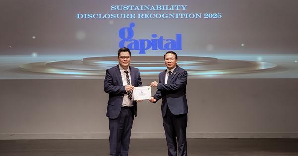 มิติหุ้น – นายนิธาน ชัยเนตร (ขวา) รองกรรมการผู้จัดการ บริษัท จี แคปปิตอล จำกัด (มหาชน) หรือ GCAP รับมอบรางวัลเกียรติคุณ “Sustainability Disclosure Award” ประจำปี 2568 จากนายวรณัฐ เพียรธรรม ผู้อำนวยการ สถาบันไทยพัฒน์ (ซ้าย) ณ ห้องออดิทอเรียม ชั้น 5 หอศิลป์กรุงเทพฯ ในวันที่ 25 พฤศจิกายน 2568 ที่ผ่านมา รางวัลดังกล่าวแสดงถึงเจตนารมณ์
