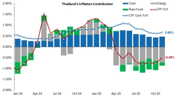 • สำหรับ 11 เดือนแรกของปี 2025 อัตราเงินเฟ้อทั่วไป (Headline CPI) หดตัวมากขึ้นที่ -0.12% สะท้อนแนวโน้มเงินฝืดที่ยืดเยื้อ ขณะที่อัตราเงินเฟ้อพื้นฐาน (Core CPI) อยู่ที่ 0.86%