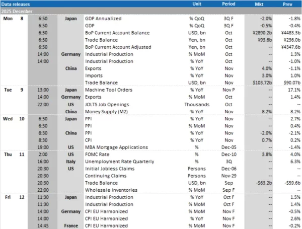 • สหรัฐฯ: ผลการประชุมธนาคารกลางสหรัฐฯ (FOMC), ยอดขอรับสวัสดิการว่างงานครั้งแรก (Initial Jobless Claims) สิ้นสุดสัปดาห์ ณ วันที่ 6 ธ.ค., ดุลการค้า (Trade Balance) และสินค้าคงคลังภาคการค้าส่ง (Wholesale Inventories) เดือน ก.ย.