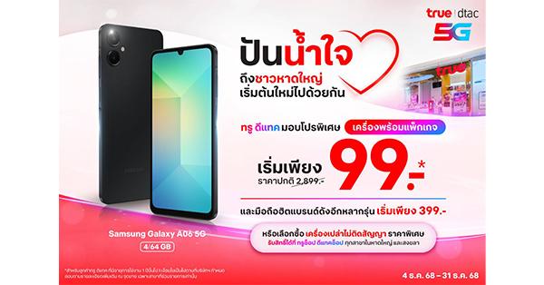 • Samsung Galaxy A06 5G เริ่มเพียง 99 บาท (ปกติ 2,899 บาท) พร้อมแพ็กเกจรายเดือน 599 บาท สำหรับลูกค้าทรูดีแทครายเดือนที่มีอายุการใช้งานตั้งแต่ 1 ปีขึ้นไป