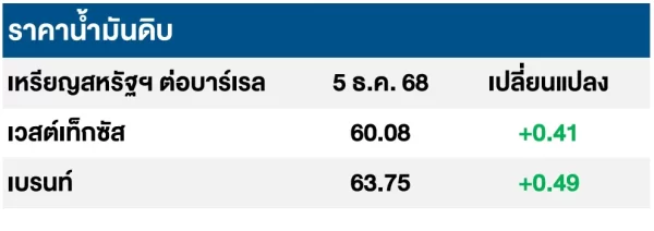 (+) ราคาน้ำมันดิบเวสต์เท็กซัสและเบรนท์ปรับเพิ่มขึ้น หลังตลาดยังคงจับตาผลการเจรจาสันติภาพครั้งล่าสุดเพื่อยุติสงครามระหว่างคณะผู้แทนสหรัฐฯ และยูเครน ซึ่งจัดขึ้นที่รัฐฟลอริดา สหรัฐฯ อย่างใกล้ชิด นอกจากนี้ ตลาดยังคงได้รับแรงหนุนหลังยูเครนยังคงโจมตีโครงสร้างพื้นฐานด้านพลังงานของรัสเซียอย่างต่อเนื่อง โดยวานนี้ยูเครนยังคงโจมตีโรงกลั่นและท่าขนส่งน้ำมันดิบของรัสเซีย