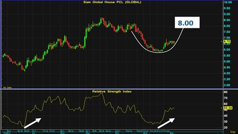 กราฟ GLOBAL ส่งสัญญาณการม้วนตัวจากแนวขาลงในระยะกลางเข้าสู่แนวฟอร์มตัวของขาขึ้น โดยโครงสร้างระยะสั้นเป็นรูปถ้วย และ Buy signal ใน RSI จะทำให้กราฟเด้งตัวไป 8 บาทต่อไป