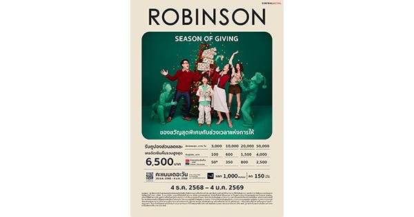 มาร่วมส่งท้ายปีเก่า ต้อนรับปีใหม่ด้วยความสุขแบบเต็มแม็กซ์ ในเทศกาลแห่งการให้กับแคมเปญ “ROBINSON SEASON OF GIVING” ตั้งแต่วันนี้ – 4 ม.ค. 69 ที่ห้างโรบินสันทุกสาขา และทุกช่องทางการช้อปปิ้งสุดสะดวกของห้างโรบินสัน ไม่ว่าจะเป็น Robinson Chat & Shop, Robinson Personal Shopper On Demand ผู้ช่วยช้อปส่วนตัว. Central App และเว็บไซต์ www.central.co.th ตลอด 24 ชั่วโมง รวมทั้ง Facebook Page: Robinson Department Store