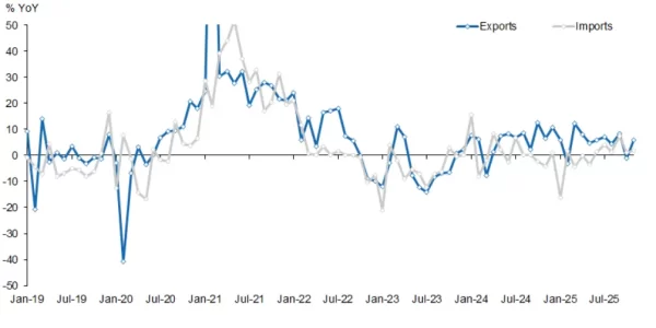 - ด้านการส่งออกแยกตามหมวดหมู่สินค้าหลัก พบว่า การส่งออกรถยนต์เพิ่มขึ้น 53.0% YoY (vs. 34.0% YoY ในเดือน ต.ค.) การส่งออกผลิตภัณฑ์เหล็กและเหล็กกล้าเพิ่มขึ้น 4.3% YoY (vs. -14.4% YoY ในเดือน ต.ค.) การส่งออกชิป (Chips) เพิ่มขึ้น 34.2% (vs. 26.9% YoY ในเดือน ต.ค.) และการส่งออกแร่หายาก (Rare-earth ores and minerals) เพิ่มขึ้น 35.0% (vs. 42.9% YoY ในเดือน ต.ค.)