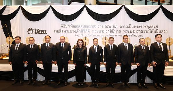 ผู้บริหารและพนักงานกลุ่ม ปตท. ล้วนสำนึกในพระมหากรุณาธิคุณอันหาที่สุดมิได้และร่วมถวายความอาลัย สมเด็จพระนางเจ้าสิริกิติ์ พระบรมราชินีนาถ พระบรมราชชนนีพันปีหลวง พร้อมมุ่งสืบสานพระราชปณิธาน ในการสร้างความมั่นคงทางพลังงานของชาติ ควบคู่กับการดูแลสังคม ชุมชน สิ่งแวดล้อม เพื่อร่วมสร้างความยั่งยืนแก่ประเทศสืบไป