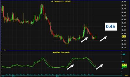 กราฟ GCAP (week) อ่อนตัวถึงแนวรับ และเริ่มสร้างฐานออกด้านข้าง ขณะที่ Stoch ลงสู่แนว Support และกำลังโค้งตัวขึ้น จะทำให้กราฟเด้งตัว จากนี้ไป โดยมีแนวต้านแรกที่ ระดับ 0.45บาท