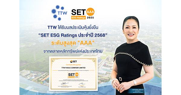 มิติหุ้น – บริษัท ทีทีดับบลิว จำกัด (มหาชน) หรือ TTW ได้รับการประเมินหุ้นยั่งยืน “SET ESG Rating” ในระดับสูงสุด AAA ประจำปี 2568 จากตลาดหลักทรัพย์แห่งประเทศไทย โดยเป็น 1 ใน 265 บริษัทจดทะเบียนที่ผ่านการคัดเลือกและได้รับการประเมินหุ้นยั่งยืน SET ESG Ratings แสดงถึงความมุ่งมั่นในการพัฒนาการดำเนินงานด้านความยั่งยืนของบริษัทอย่างต่อเนื่อง โดยนำแนวคิดด้านความยั่งยืนเข้าเป็นส่วนหนึ่งในกระบวนการดำเนินธุรกิจครอบคลุม ESG ทั้งมิติสิ่งแวดล้อม สังคม เศรษฐกิจ และธรรมาภิบาล