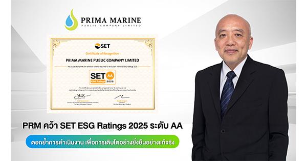มิติหุ้น – บริษัท พริมา มารีน จำกัด (มหาชน) หรือ PRM ผู้นำธุรกิจขนส่ง และการสนับสนุนทางทะเลในอุตสาหกรรมปิโตรเลียมของไทย ได้ประกาศถึงความสำเร็จด้านพันธกิจความยั่งยืนอีกครั้ง หลังได้รับการประเมินหุ้นยั่งยืน “SET ESG Ratings” ในปี 2568 ที่ระดับ “AA” ในประเภทกลุ่มอุตสาหกรรมบริการ จากตลาดหลักทรัพย์แห่งประเทศไทย ซึ่งถือเป็นผลลัพธ์จากความมุ่งมั่นในการพัฒนาธุรกิจสู่ความยั่งยืน ตามเป้าหมายที่บริษัทฯ ได้วางไว้ในระยะยาว