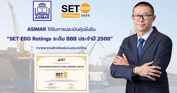 มิติหุ้น – บริษัท เอเชียน มารีน เซอร์วิสส์ จำกัด (มหาชน) หรือ ASIMAR ได้รับการประเมินด้านความยั่งยืนจาก SET ESG Ratings ในระดับ “BBB” ประจำปี 2568 ซึ่งจัดทำโดย ตลาดหลักทรัพย์แห่งประเทศไทย การประเมินดังกล่าวสะท้อนถึงแนวทางการดำเนินธุรกิจของบริษัทที่ให้ความสำคัญกับการบูรณาการมิติด้านสิ่งแวดล้อม สังคม และการกำกับดูแลกิจการ (Environmental, Social and Governance: ESG) เข้ากับกระบวนการบริหารจัดการและการดำเนินงานขององค์กร ตามหลักเกณฑ์และมาตรฐานที่ตลาดหลักทรัพย์แห่งประเทศไทยกำหนด