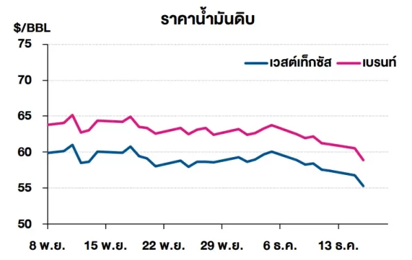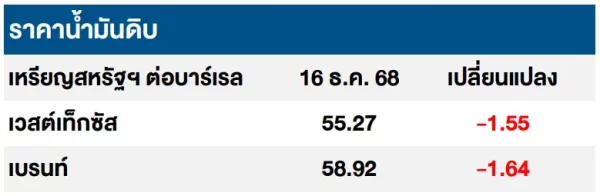 (-)  ราคาน้ำมันดิบเวสต์เท็กซัสและเบรนท์ปรับลด จากความคืบหน้าในการเจรจาข้อตกลงสันติภาพเพื่อยุติความขัดแย้งระหว่างรัสเซียและยูเครน ซึ่งอาจปูทางให้มีการผ่อนคลายหรือยกเลิกมาตรการคว่ำบาตรต่อรัสเซีย และส่งผลให้รัสเซียสามารถส่งออกน้ำมันเข้าสู่ตลาดโลกได้มากขึ้น โดยประธานาธิบดีโดนัลด์ ทรัมป์ ระบุว่า ข้อตกลงสันติภาพดังกล่าวกำลังใกล้ความเป็นจริงมากกว่าที่เคยเป็นมา หลังมีการเจรจาอย่างต่อเนื่องระหว่างผู้นำยุโรปและประธานาธิบดีโวโลดีเมียร์ เซเลนสกี ที่กรุงเบอร์ลิน ขณะที่ผู้นำยุโรปตกลงที่จะมีส่วนร่วมในหลักประกันด้านความมั่นคงให้กับยูเครน หลังยูเครนส่งสัญญาณพร้อมละทิ้งความหวังในการเข้าเป็นสมาชิก NATO เพื่อแลกกับหลักประกันด้านความมั่นคงจากชาติตะวันตก