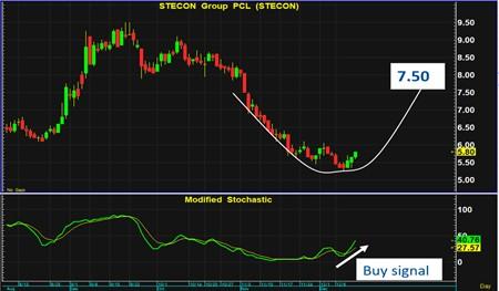 กราฟ STECON   มีโครงสร้างเป็น U-Curve แบบแข็งแรง ในระดับ Bottom ซึ่งจะมีแรงเหวี่ยง ได้ค่อนข้างมาก ขณะที่ Stoch เกิดการชี้ ขึ้นเป็น Buy signal สนับสนุนให้กราฟจะดีดตัวได้อย่างดี โดยมีแนวต้านที่ 7.50 บาท