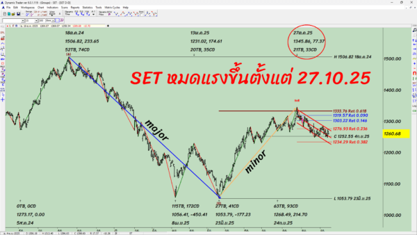 ภาพใหญ่ยังไม่เปลี่ยนแปลง ทิศทางหลัก (Major) คือการทิ้งตัวจากยอด 1506 ลงมาหา 1053 แรงขายยังคงคุมเกมอยู่หมัด
