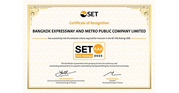 มิติหุ้น – บริษัท ทางด่วนและรถไฟฟ้ากรุงเทพ จำกัด (มหาชน) หรือ BEM ผู้ให้บริการทางพิเศษและรถไฟฟ้า MRT ได้รับการประเมิน “หุ้นยั่งยืน SET ESG Ratings” ประจำปี 2568 ที่ระดับสูงสุด “AAA” จากตลาดหลักทรัพย์แห่งประเทศไทย ติดอันดับรายชื่อหุ้นยั่งยืนต่อเนื่องเป็นปีที่ 9 ในกลุ่มบริการ (Services) ตอกย้ำความมุ่งมั่นในการพัฒนาองค์กรให้เติบโตมั่นคงอย่างต่อเนื่อง ขับเคลื่อนธุรกิจควบคู่กับการสร้างความยั่งยืนในทุกมิติ ได้แก่ สิ่งแวดล้อม สังคม บรรษัทภิบาลและเศรษฐกิจ (Environmental, Social, Governance: ESG) ซึ่ง BEM ให้ความสำคัญแก่ผู้มีส่วนได้เสียทุกกลุ่ม อย่างรอบด้าน พร้อมส่งมอบการบริการคมนาคมขนส่งที่ปลอดภัย สะดวก และรวดเร็ว ช่วยยกระดับการใช้ชีวิตของผู้คนในเมือง