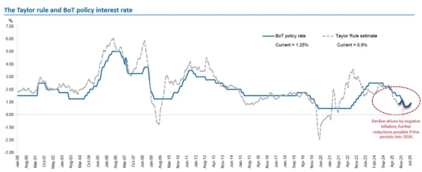 - ท่ามกลางความเสี่ยงด้านต่ำที่เพิ่มสูงขึ้นและการขยายตัวทางเศรษฐกิจที่ยังต่ำกว่าศักยภาพ เราคาดว่าจะมีการปรับลดอัตราดอกเบี้ยนโยบายลง 0.25% ต่อเนื่องอีกครั้ง ในการประชุมครั้งถัดไปวันที่ 25 กุมภาพันธ์ 2026