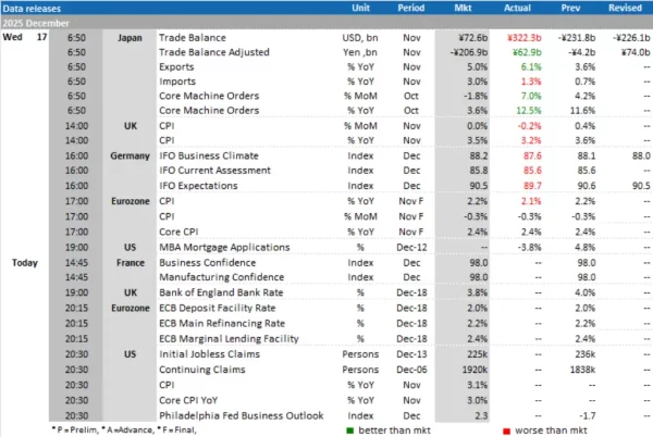 - สหรัฐฯ: ยอดขอรับสวัสดิการว่างงานครั้งแรก (Initial Jobless Claims) สิ้นสุดสัปดาห์ ณ วันที่ 13 ธ.ค. และดัชนีราคาผู้บริโภค (CPI) เดือน พ.ย.