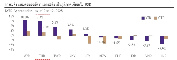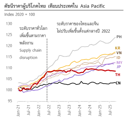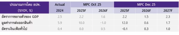 จากมาตรการภาษีนำเข้าสหรัฐฯ และมีปัจจัยลบ/ปัจจัยเสี่ยงเข้ามาเพิ่มเติม ได้แก่ (1) สถานการณ์น้ำท่วมภาคใต้ จะยังส่งผลลบต่อเศรษฐกิจต่อเนื่องไปถึงช่วงปีหน้า และ (2) ความไม่แน่นอนทางการเมือง อาจทำให้งบประมาณปี 2027 ประกาศใช้ล่าช้า - อัตราเงินเฟ้อทั่วไปปีนี้จะเฉลี่ยติดลบ และไม่เข้ากรอบเป้าหมายในปีหน้า โดยยังคงเป็นผลจากราคาพลังงานที่ปรับลดลงตามราคาพลังงานโลก และมาตรการอุดหนุนของภาครัฐ โดยความเสี่ยงภาวะเงินฝืดยังมีไม่มาก