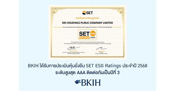 มิติหุ้น – บริษัท บีเคไอ โฮลดิ้งส์ จำกัด (มหาชน) หรือ BKIH ได้รับผลการประเมินอยู่ในรายชื่อหุ้นยั่งยืนของตลาดหลักทรัพย์แห่งประเทศไทย (SET ESG Ratings) ประจำปี 2568 ในระดับ AAA ซึ่งเป็นระดับสูงสุดติดต่อกัน 3 ปีต่อเนื่อง ตั้งแต่ปี 2566 – 2568 อีกทั้งยังได้รับผลคะแนนรวมสูงกว่าค่าเฉลี่ยในกลุ่มอุตสาหกรรมธุรกิจการเงิน โดยการประเมินในภาพรวมการดำเนินงานของบริษัทฯ ตามกระบวนการขับเคลื่อนองค์กรสู่ความยั่งยืนในมิติสิ่งแวดล้อม สังคม และบรรษัทภิบาล (Environmental, Social and Governance หรือ ESG) รวมถึงมีคุณสมบัติของบริษัทจดทะเบียนตามที่ตลาดหลักทรัพย์ฯ กำหนด โดยผลการดำเนินงานด้าน ESG ของบีเคไอ โฮลดิ้งส์มีความโดดเด่นในการดำเนินธุรกิจที่ให้ความสำคัญกับความรับผิดชอบต่อสิ่งแวดล้อม สังคม ภายใต้การกำกับดูแลกิจการที่ดี รวมถึงมีการบริหารจัดการความเสี่ยงอย่างเหมาะสม ใช้กลยุทธ์ในการดำเนินงานอย่างสร้างสรรค์ โดยคำนึงถึงผลกระทบทั้งเชิงบวกและเชิงลบที่มีต่อผู้มีส่วนได้เสียทุกกลุ่มทั้งผู้ถือหุ้น ลูกค้า คู่ค้า พนักงาน หน่วยงานกำกับดูแล ตลอดจนสังคมและชุมชน เพื่อยืนหยัดการเติบโตทางธุรกิจอย่างมั่นคงและแข็งแกร่ง พร้อมยกระดับมาตรฐานองค์กรสู่ความยั่งยืนในระยะยาว