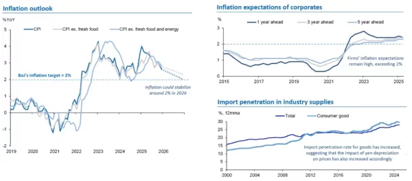 - อัตราเงินเฟ้อของญี่ปุ่นยังอยู่ในระดับสูงกว่าเป้าหมายของธนาคารกลางญี่ปุ่น (BoJ) ที่ 2.0% ต่อเนื่องมาเป็นระยะเวลากว่า 3 ปี แม้มีแนวโน้มชะลอตัวลงสู่ระดับใกล้เคียงกับ 2.0% มากขึ้นในปีหน้า ตามทิศทางของอัตราเงินเฟ้อในหมวดอาหารที่มีแนวโน้มชะลอลง ขณะที่การเติบโตของค่าจ้าง (Wage growth) ในปีที่ผ่านมาอยู่ในระดับสูงสุดในรอบกว่า 30 ปี และมีแนวโน้มแข็งแกร่งต่อเนื่องในปี 2026 จากตลาดแรงงานที่ตึงตัวและอัตราเงินเฟ้อที่ยังอยู่ในระดับสูง ส่งผลให้วงจร Wage-price spiral ในญี่ปุ่นมีแนวโน้มดำเนินต่อไป ทั้งนี้ อัตราเงินเฟ้อของญี่ปุ่นในระยะต่อไปยังมีความเสี่ยงด้านสูงจากคาดการณ์เงินเฟ้อที่ยังอยู่ในระดับสูง โดยคาดการณ์เงินเฟ้อของภาคธุรกิจยังทรงตัวอยู่ในระดับที่สูงกว่า 2.0% ซึ่งอาจส่งผลต่อพฤติกรรมการกำหนดราคาสินค้าและบริการ ประกอบกับการอ่อนค่าของเงินเยนในช่วงที่ผ่านมาอาจส่งผลให้ราคาสินค้านำเข้า (Import price) ปรับสูงขึ้นได้