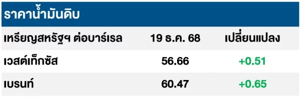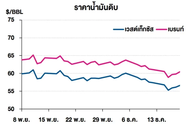 (-) Goldman Sachs คาดการณ์ราคาน้ำมันดิบเบรนท์ในปี 2569 จะอยู่ที่ระดับ 56 เหรียญสหรัฐฯ ต่อบาร์เรล หลังคาดการณ์ว่าตลาดยังคงเผชิญแรงกดดันจากอุปทานน้ำมันดิบที่ยังคงปรับเพิ่มขึ้นอย่างต่อเนื่อง โดยคาดตลาดน้ำมันดิบจะเกินดุล (Surplus) ที่ระดับ 2 ล้านบาร์เรลต่อวันในปี 2569 การคาดการณ์ดังกล่าวสอดคล้องกับมุมมองจาก Trafigura ซึ่งมองว่าราคาน้ำมันดิบเบรนท์จะอยู่ที่ระดับ 50 เหรียญสหรัฐฯ ต่อบาร์เรล ในช่วงกลางปี 2569