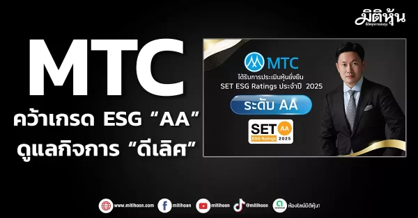 มิติหุ้น – บริษัท เมืองไทย แคปปิตอล จำกัด (มหาชน) หรือ MTC ได้รับการยอมรับด้านการดำเนินธุรกิจอย่างยั่งยืนจากตลาดหลักทรัพย์แห่งประเทศไทยต่อเนื่องเป็นปีที่ 7 พร้อมได้รับการจัดอันดับ SET ESG Ratings ระดับ AA ประจำปี 2568 ในกลุ่มธุรกิจการเงิน (Financials)