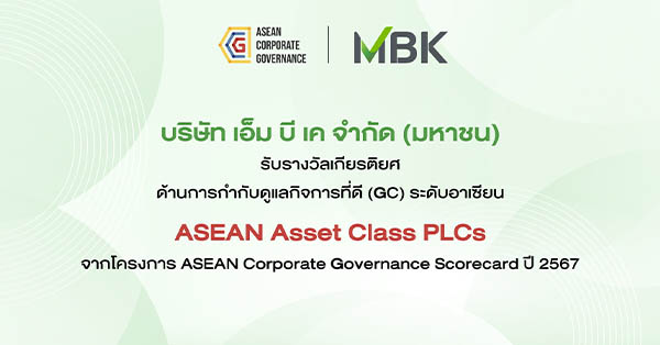 มิติหุ้น – บริษัท เอ็ม บี เค จำกัด (มหาชน) หรือ MBK กลุ่มบริษัทชั้นนำของประเทศที่เติบโตอย่างมั่นคง มุ่งมั่นในการลงทุนและประกอบธุรกิจที่ให้ผลตอบแทนอย่างยั่งยืน ได้รับการประเมินการกำกับดูแลกิจการที่ดีของบริษัทจดทะเบียนในประเภท ASEAN Asset Class PLCs จาก โครงการ ASEAN Corporate Governance Scorecard (ASEAN CG Scorecard) ประจำปี 2567 ซึ่งเป็น 1 ใน 74 บริษัทจดทะเบียนไทยที่ได้รับรางวัล สะท้อนให้เห็นถึงความมุ่งมั่นของ MBK ที่ยกระดับการกำกับดูแลกิจการที่ดี ที่มีความโปร่งใส มีความรับผิดชอบต่อสังคมและสิ่งแวดล้อม รวมถึงการมีจริยธรรมในการดำเนินธุรกิจเพื่อสร้างคุณค่าอย่างยั่งยืนให้กับองค์กรและผู้มีส่วนได้เสีย