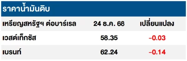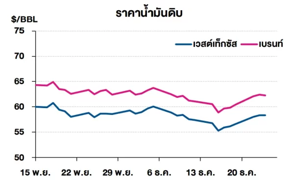 (-) ราคาน้ำมันดิบปรับลด หลังปริมาณการส่งออกน้ำมันดิบของรัสเซียสำหรับสัปดาห์สิ้นสุด ณ วันที่ 21 ธ.ค. 68 ปรับขึ้นมาอยู่ที่ระดับ 3.87 ล้านบาร์เรลต่อวัน ซึ่งถือเป็นระดับที่สูงที่สุดนับตั้งแต่เดือน พ.ค.66 อย่างไรก็ดี การนำเข้าน้ำมันดิบรัสเซียของจีนและรัสเซียยังคงเผชิญกับความไม่แน่นอนจากมาตรคว่ำบาตรครั้งล่าสุดของรัฐบาลสหรัฐฯ ส่งผลให้ล่าสุดปริมาณน้ำมันดิบของรัสเซียซึ่งลอยลำอยู่ในทะเลอยู่ที่ระดับ 185 ล้านบาร์เรล