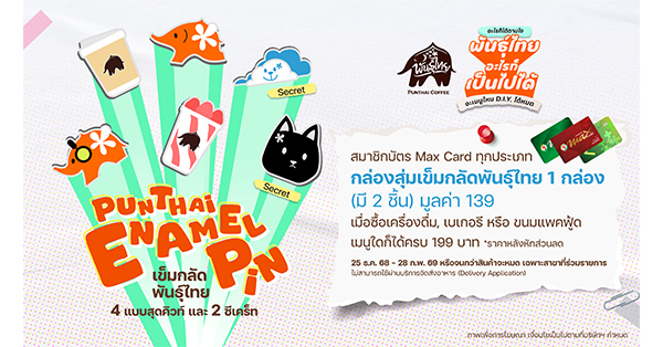 รับฟรี! กล่องสุ่มเข็มกลัดพันธุ์ไทย 1 กล่อง (2 ชิ้น) มูลค่า 139.- เมื่อซื้อเครื่องดื่ม เบเกอรี หรือ ขนมแพคฟู้ด เมนูใดก็ได้ ครบ 199 บาท/ใบเสร็จ (หลังหักส่วนลด) สิทธิพิเศษสำหรับสมาชิก Max Card ทุกประเภท