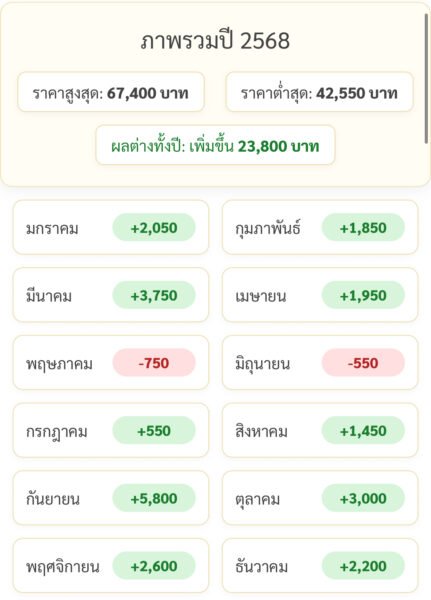 ก่อนอื่นจะไม่พูดถึงราคาในปี 2568 ก็คงไม่ได้ เพราะในปีนี้ถือเป็นปีที่ราคาทองคำขยับตัวได้รุนแรง นับตั้งแต่เดือน มกราคม มาจนถึงเดือน ธันวาคม เรียกว่าราคากระโดดมาจากปี 2567 ถึงบาทละ 23,800 บาทเลยทีเดียว และปรับขึ้นแรงสุดในเดือน กันยายน ที่ขยับขึ้นบาทละ 5,800 บาท รวมทั้งยังมีส่วนต่างราคาสูงสุดต่ำสุดที่ห่างกันมากถึง 24,850 บาท เพราะราคาสูงสุดดีดตัวไปที่บาทละ 67,400 บาท ส่วนราคาต่ำสุดอยู่ที่ 42,550 บาท ผันผวนจนชวนงง จากปัญหาต่าง ๆ ที่เข้ามากดดันรอบด้าน