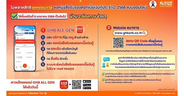 ลูกค้าสามารถดาวน์โหลดหนังสือรับรองดอกเบี้ยเงินกู้ได้แล้วตั้งแต่วันที่ 6 มกราคม 2569 เป็นต้นไป สอบถามรายละเอียดเพิ่มเติมได้ที่ G H Bank Call Center โทร 0-2645-9000 และติดตามข่าวสารของธนาคาร