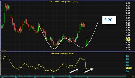 กราฟ TFG ทิ้งตัวลงจากแรงขายบนแนว Overbought ลงสู่ Oversold ในเวลาอันรวดเร็ว เกิดเร็วจึงจบเร็ว คาดว่ากราฟจะเริ่มดีดตัวขึ้นกลับไปยังแนวที่เคยปรับตัวลงที่ 5.20 บาท ดังนั้นแนวรับแถวนี้จึงสำคัญและ Down side risk ในระดับที่ต่ำมาก